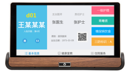 患者可通過桌牌或平板了解自身當(dāng)前病情狀態(tài),費(fèi)用查詢并完成在線支付;可以查看多媒體宣教學(xué)習(xí)相關(guān)病理知識,盡量配合醫(yī)護(hù)工作;查看醫(yī)院最新動態(tài)消息,如某某專甲今日在我院出診等等;可以訂餐,通過與醫(yī)院食堂對接數(shù)據(jù)完成訂餐操作。還有院內(nèi)陪護(hù)申請,物品申請等多種功能模塊