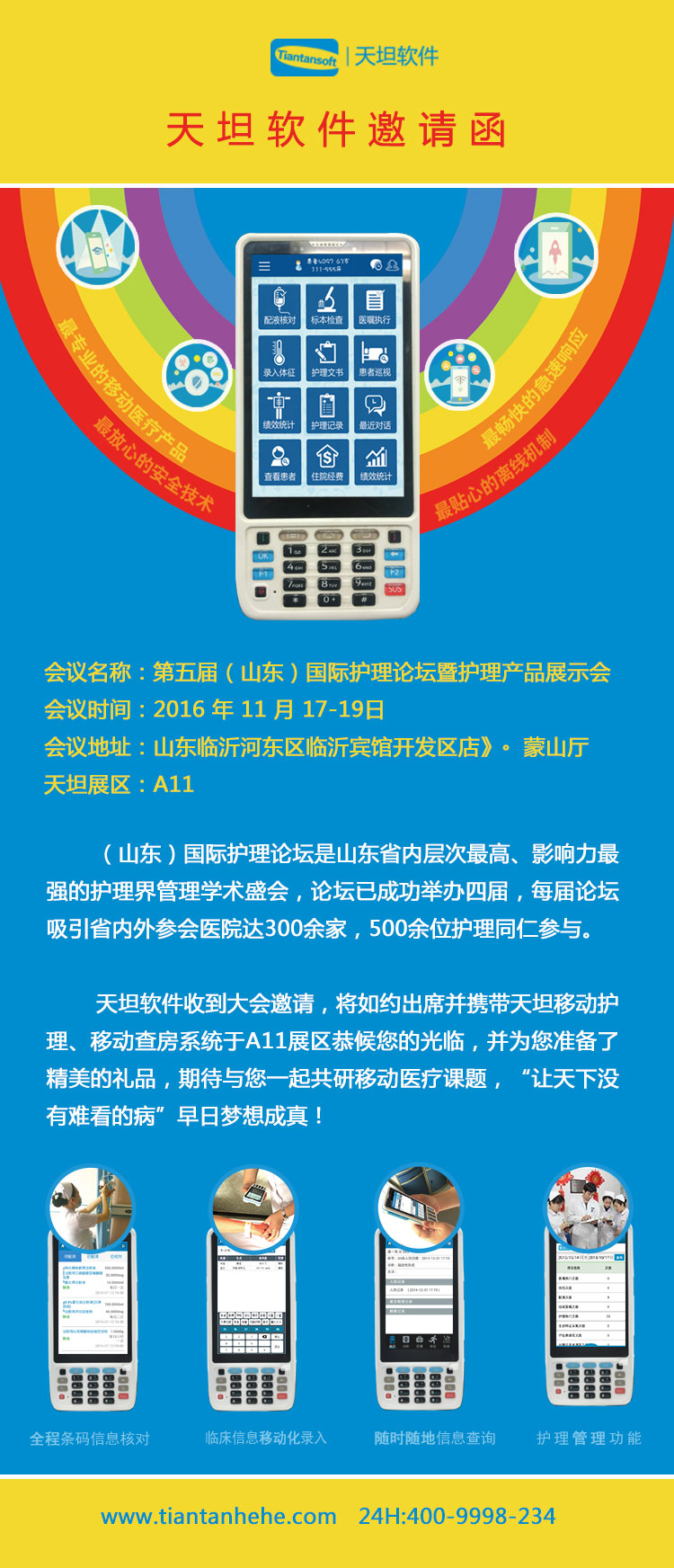 天坦軟件恭祝“第五屆(山東)國際護(hù)理論壇暨護(hù)理產(chǎn)品展示會(huì)”如期舉辦并取得圓滿成功,也期待這一次行業(yè)的交流盛會(huì)的到來,共同學(xué)習(xí)、共同進(jìn)步。天坦軟件將于A11展臺(tái)前恭候您的光臨。