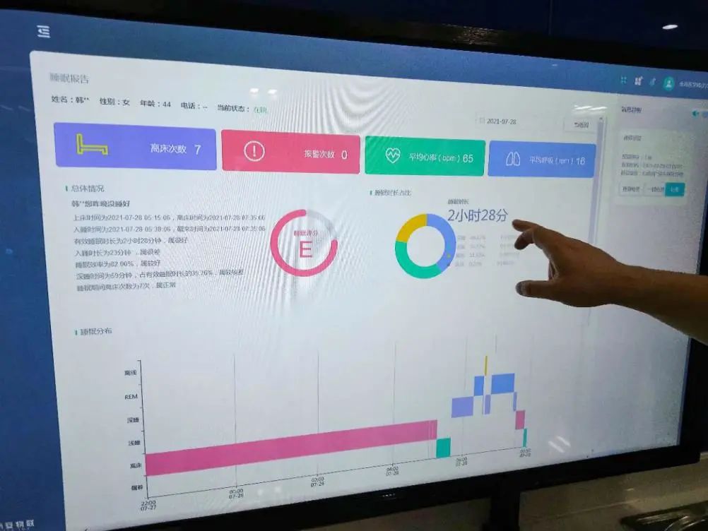 除了輸液外,患者的生命體征和運(yùn)動(dòng)軌跡也是醫(yī)護(hù)人員需要時(shí)刻操心的問題。智慧病房搭建智能在床實(shí)時(shí)監(jiān)測(cè)系統(tǒng),在床墊下放置了傳感器,可以精準(zhǔn)測(cè)量和傳輸患者的生命體征、睡眠、離床等數(shù)據(jù),一旦數(shù)據(jù)異?;蛘呋颊唛L(zhǎng)時(shí)間不在監(jiān)測(cè)范圍內(nèi),系統(tǒng)會(huì)自動(dòng)進(jìn)行異常或離床、跌落等警報(bào),可以及時(shí)避免意外事件發(fā)生。