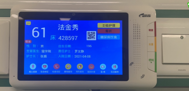 入住科室的第一天,護(hù)士會對患者進(jìn)行“入院宣教”,除了正常的住院注意事項外,還專門指導(dǎo)患者學(xué)會了病床上方患者端的“ 智能電子床頭屏”,它是患者住院期間的信息小助手,通過它不僅可以查詢患者的體征數(shù)據(jù)、護(hù)理事項、住院費用、檢查項目預(yù)約情況、住院及治療須知等豐富信息,還可以提供點餐、醫(yī)療服務(wù)評價等服務(wù)。